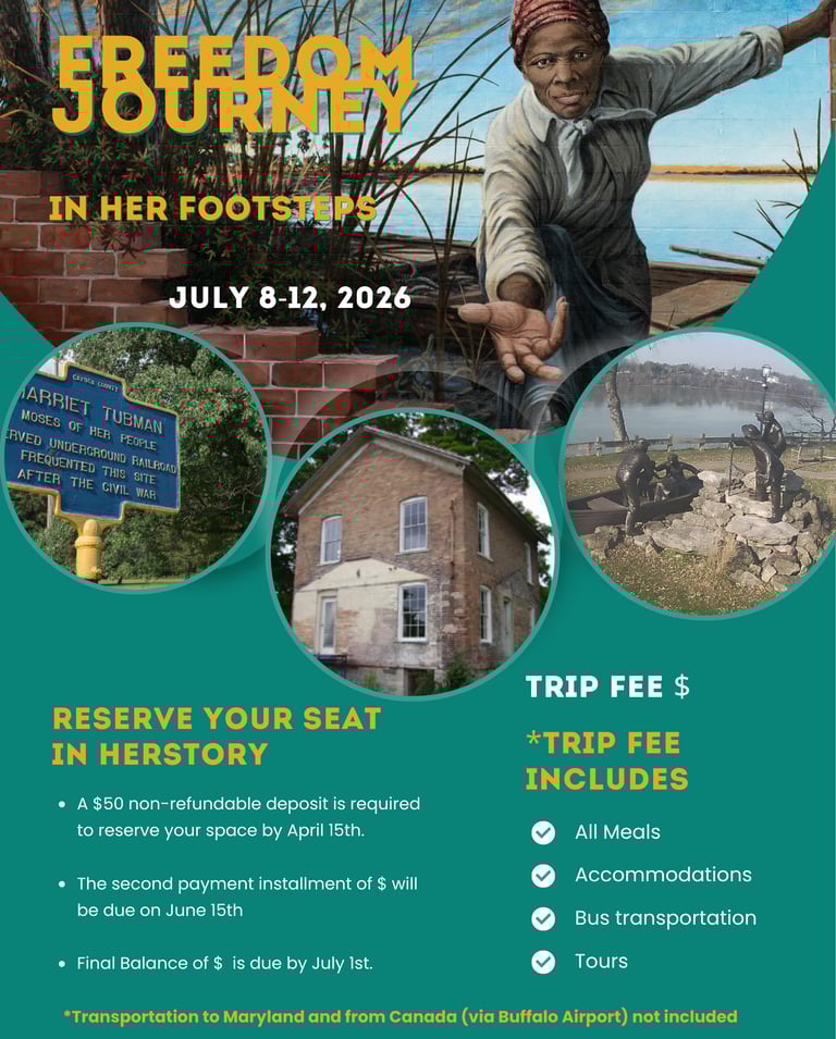 Join us for a transformative, multi-state journey tracing the path of Harriet Tubman and the heroes of the Underground Railroad. From the shores of Maryland to the roar of Niagara Falls, experience history where it happened!